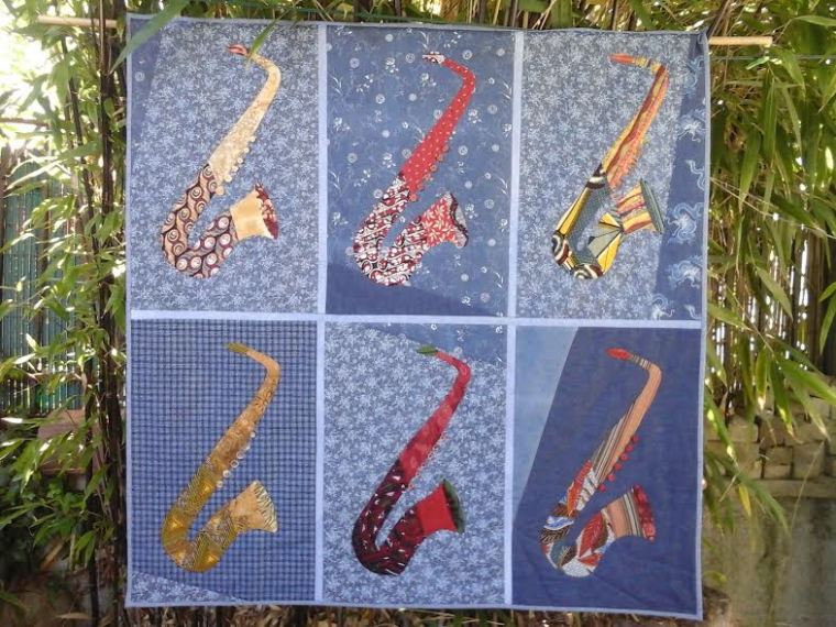 Chantal Bommier a utilisé des wax pour le quilt présenté dans BeeBook, Harmonie en Ébène-Ivoire, vu ici et, de son séjour de 2 ans au milieu des années 80 au Cameroun, elle garde encore de nombreux tissus ! Vous pouvez voir d’autres réalisations par ici.
