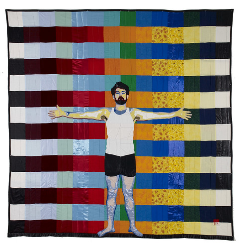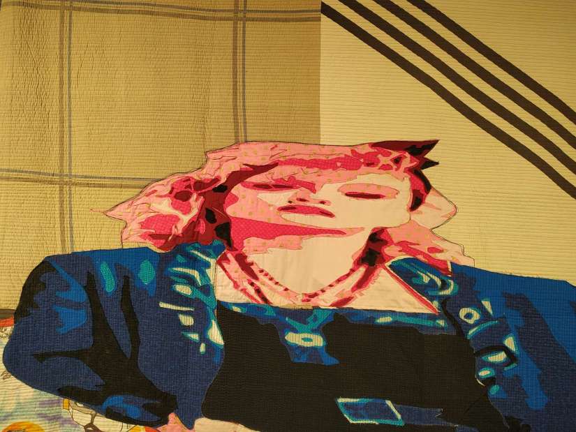 Sewlebrity, une sacrée expo ! Ces quilts nous font perdre nos repères : sont-ils apparentés à un tableau ou une sculpture ? Les personnalités sont, selon où l’on se place pour les regarder, à la limite du grotesque ou bien prodigieusement en mouvement, tels qu’on les connaît. Des croix et des flèches par terre nous aident pour voir le personnage normal, avec l’angle juste. Challenge parfaitement réussi, bravo Luke !
