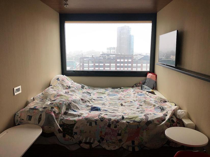 Voici son quilt de voyage dans une chambre quelque part en Europe :