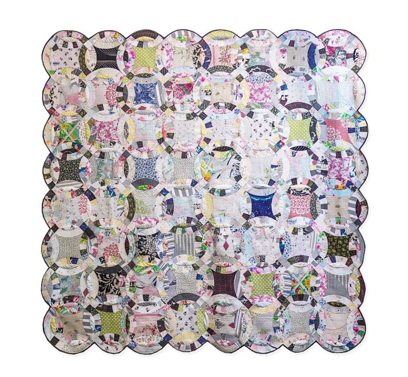 Je vous parlais en début d’article de son voyage en Europe ; Luke et sa femme se trouvent à présent en Angleterre. Et partout, un quilt les suit, comme un doudou, et pas n’importe lequel : des anneaux de mariage… à la sauce Luke ! J’ai entendu beaucoup de commentaires sur ce quilt, qui surprend par son fouillis et son charme, sa touche tradi et révolutionnaire à la fois… Décidément Luke est un artiste complexe qui déroute un certain public, tout en enchantant une autre partie. Personne, en tout cas, ne reste indifférent et on sait que la nouveauté est rarement acceptée d’emblée… Pensez aux Impressionnistes, rejetés en leur temps par les officiels…
