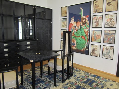 C’est maintenant une magnifique maison, bien plus luxueuse que celle du peintre, mais deux pièces sont reconstituées fidèlement : la salle à manger, avec des reproductions du mobilier 1900 de Hoffmann, et surtout son atelier, avec notamment les repros de ses derniers tableaux sur chevalet, des dessins, deux célèbres sarraus que portait le peintre : ils sont de lin, teints en indigo, avec les épaules brodées… J’aurais bien emporté ces robes confortables !