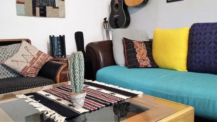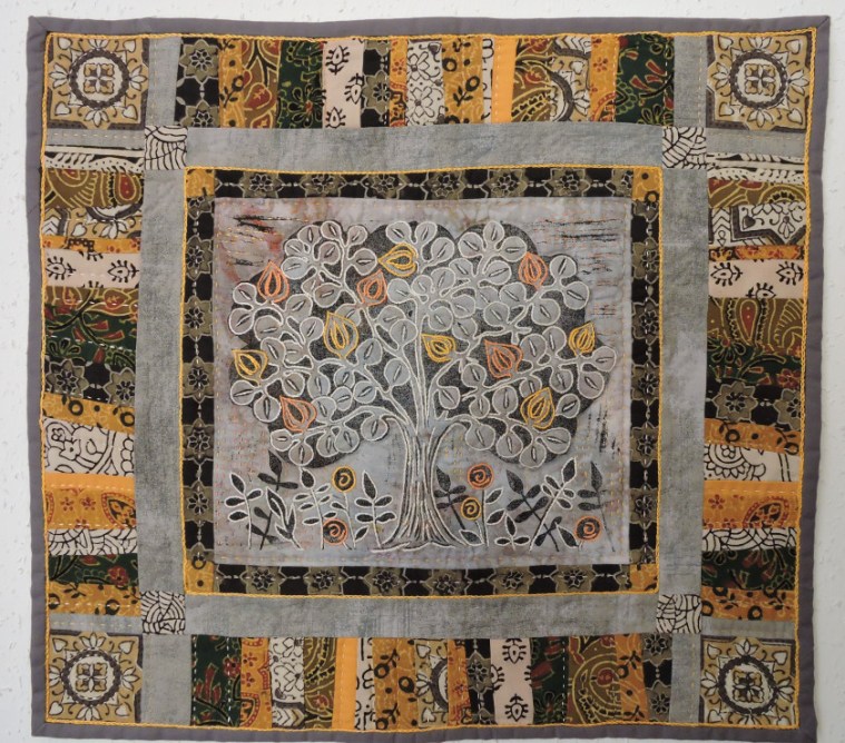 En octobre dernier, je n’ai pu éviter de tomber amoureuse d’un panneau teint et imprimé par Dijanne Cevaal, un Arbre de Vie aux grenades sur fond gris. Il n’est pas bien grand mais la broderie de toutes les feuilles et tous les fruits m’a pris un temps certain !! Cependant j’ai apprécié chaque point. La broderie terminée, j’ai trouvé que les tissus de Neelam étaient parfaitement adaptés au côté artisanal de l’ensemble. J’ai donc coupé des petites bandes irrégulières pour faire le tour. L’arbre est brodé en point de tige, son fond en point avant droit, ainsi que la plupart des bandes de la bordure. Pour ajouter de la couleur, j’ai fait deux tours au point de chaînette, en coton perlé jaune d’or. J’aime beaucoup les imprimés des angles qui font un bel effet.