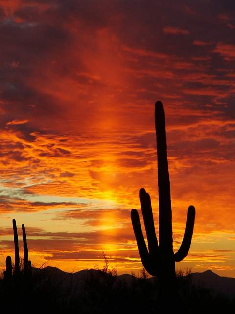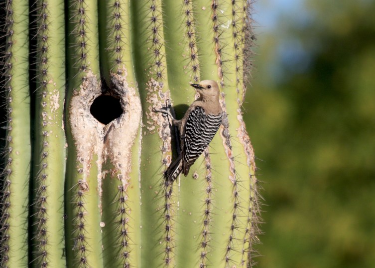 Dans ce climat semi-aride où les températures atteignent 45° et +, les saguaros sont le garde-manger et abreuvoir d’oiseaux qui se jouent de la protection des épines. Les plus grands saguaros pèsent 5 tonnes… dont 3 d’eau ! Les piverts creusent un trou pour en faire leur nid et l’année d’après, d’autres oiseaux s’y installeront. Ces hôtes sont parfois la cause du dépérissement des cactus.