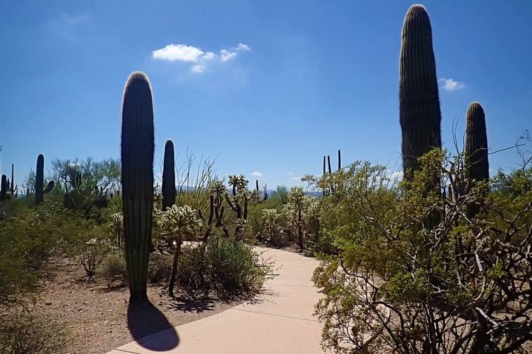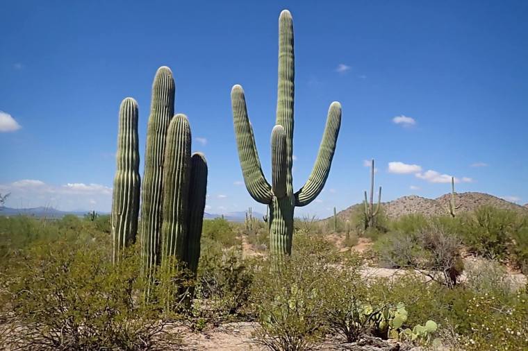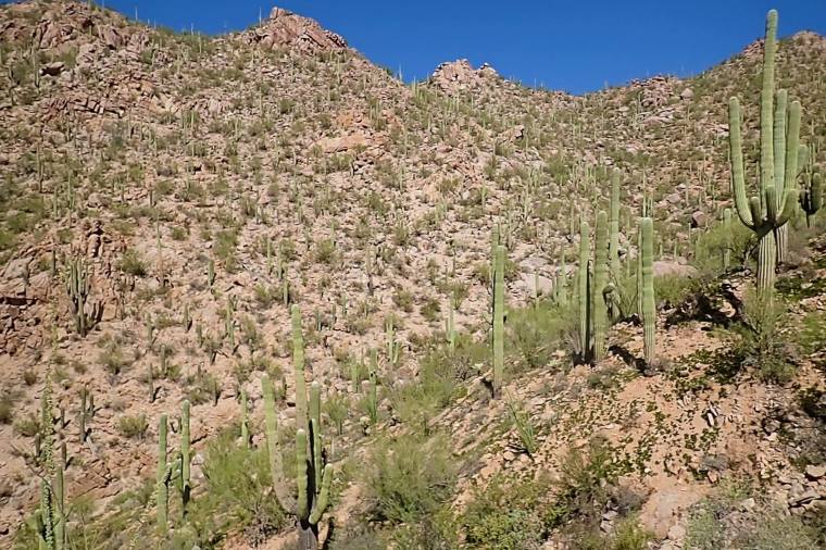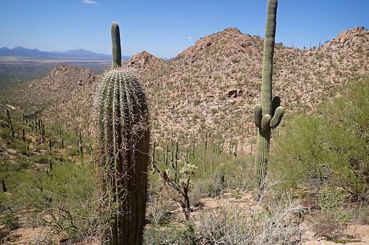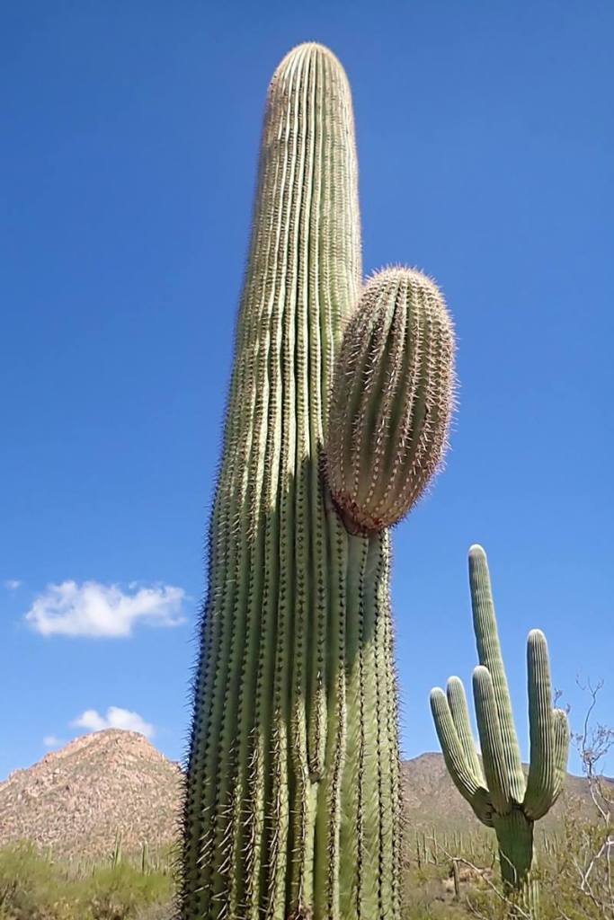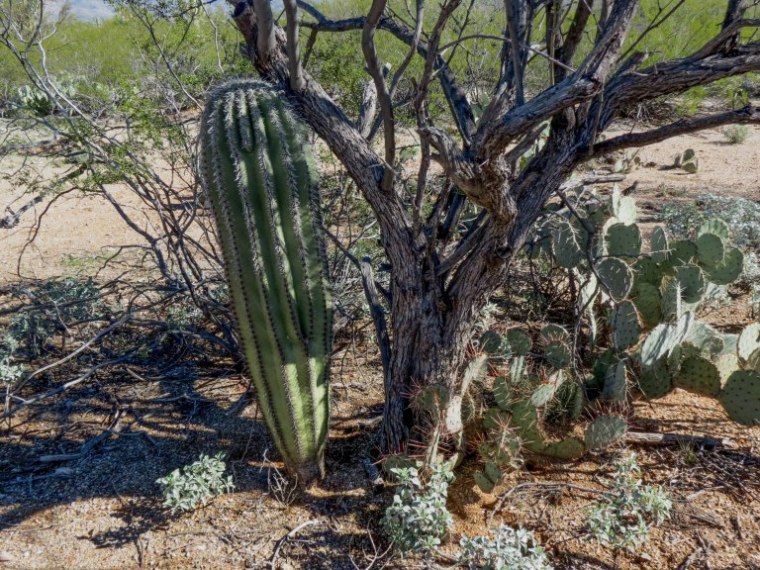 A l’ouest et l’est de la ville de Tucson se trouvent deux zones protégées où pousse, malgré le nom de désert, une grande diversité de plantes. Plusieurs randonnées sont possibles, toutes balisées. On n’a pas envie de marcher sur un serpent, une araignée ou un cactus dont certaines épines transpercent les chaussures…La vie des jeunes saguaros dépend d’autres plantes : une protection partielle leur est quasi-indispensable. Ainsi les buissons ont leur part de travail, protégeant les bébés saguaros. L’arbuste déjà bien vieux mourra sans doute dans quelques années, laissant place à ce cactus de 80 cm et donc d’environ 25 ans ici. Il aura fait son travail protecteur. Dans 10 ans, le saguaro aura environ 1 mètre de plus et produira ses premières fleurs toute blanches, puis des fruits rubis.Des bébés saguaros, ont-ils assez de protection ? Les petits plants sont plutôt rares, même dans les parcs nationaux qui les protègent.