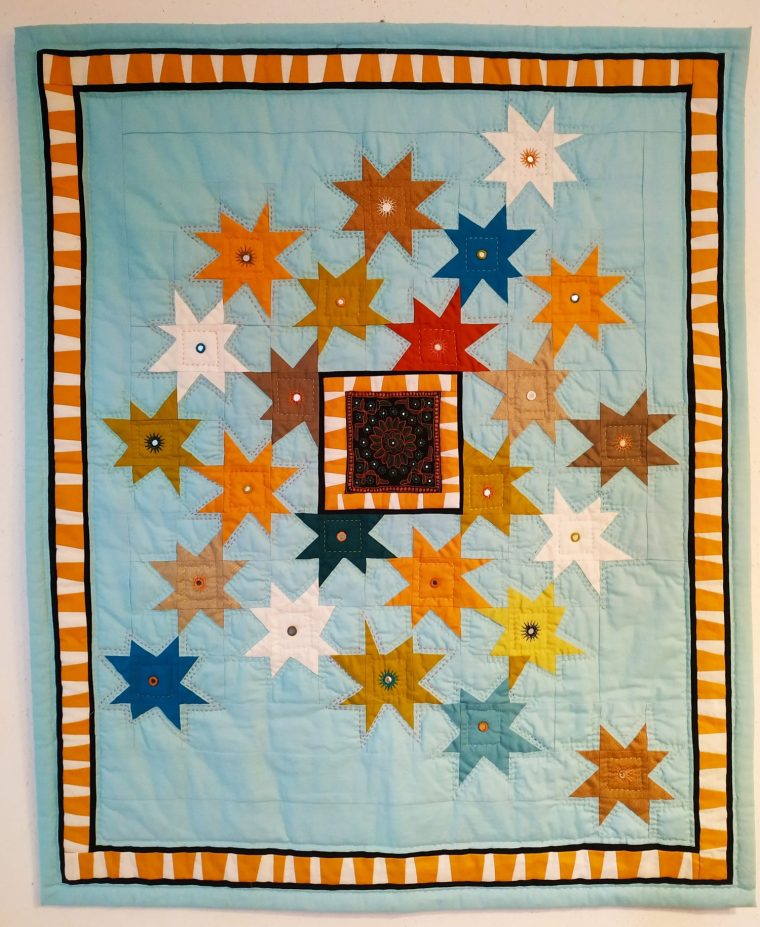 Les étoiles sont parmi les motifs les plus appréciés en patchwork. Dans BeeBook, je ne me suis pas privée d’en proposer, des étoiles pas forcément régulières, les wonky américaines, que j’ai préféré nommer étoiles créatives. À présent, le quilt qui est actuellement en bannière du blog est dans ma pièce à vivre et, malgré certaines réticences entendues sur les couleurs bizarres, il s’intègre parfaitement à mon intérieur ! Il est un hommage à Sujata Shah, si talentueuse et généreuse, dont je ne me lasse pas de promouvoir son livre (sa présentation ici), avec la contribution d’une brodeuse indienne via Neelam chez qui j’ai choisi la broderie centrale :
