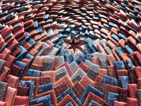Pour ma part, je suis sur le point de terminer un Pine Cone quilt, mais… tout petit, d’environ 50 cm de côté ! J’ai adoré faire les tours, assembler les triangles à la main. Il me reste à terminer les angles. J’espère l’exposer lors de notre futur événement, Fibre Occitane, sur lequel nous communiquerons prochainement.