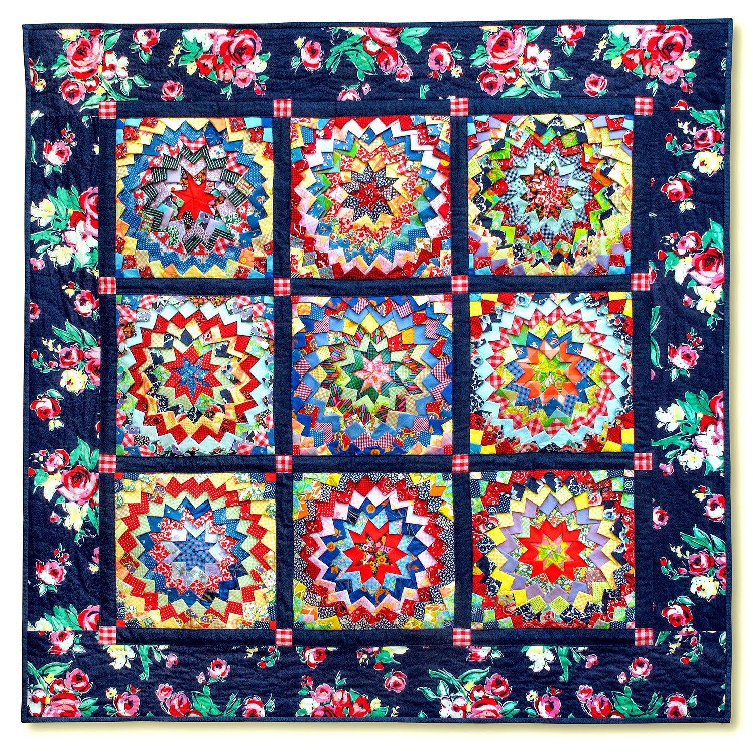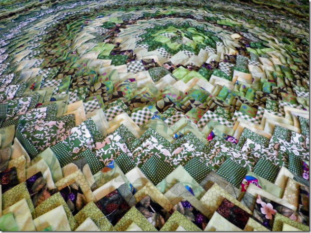 Et comme d’habitude les quilts de Pamela Goecke Dinndorf me font de l’œil. Avant de regarder son nom, j’aurais parié sur Michèle Beugnon, elle aussi très inventive dans les jeux de couleurs ! C’est là un long travail tout en triangles, mais il n’est pas lassant car il faut le faire très scrappy. Autre travail de triangles à la limite du traditionnel, les jolis moulins de Nathalie Delarge raviront les plus sages !