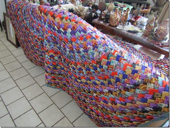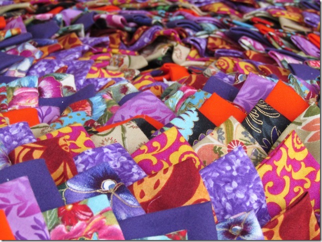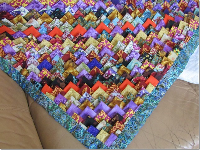 Certaines puristes disent qu’on ne peut appeler quilts les couvertures en pomme de pin car ces ouvrages n’ont pas de molleton, pourtant leurs multiples couches de tissus assurent aussi bien, sinon mieux, de la chaleur pour dormir, but primitif d’un quilt. C’est en revanche un vrai patch-work, travail de morceaux de tissus… Laissons donc là ces querelles de vocabulaire !