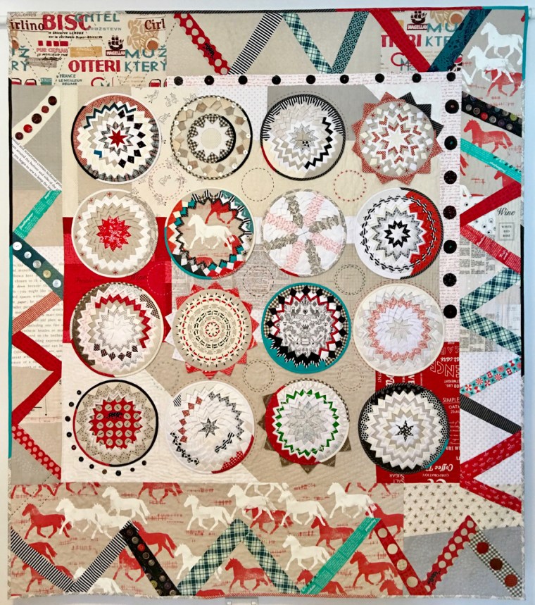 Quilt de Rachael Daisy (Australie) de 2017 intitulé Gee Whiz!, que chacun traduira à sa manière : Mince alors ! Trop bien ! Génial ! Comme par magie, avec juste un imprimé aux chevaux, on imagine tout un monde autour du cheval, les brides et les rivets, les cocardes des concours hippiques… Encore une réussite de Rachael ! Il s’agit toujours de la technique du Pine Cone Quilt que je me plais à faire connaître en France depuis que Betty m’a appris sa technique et son histoire.