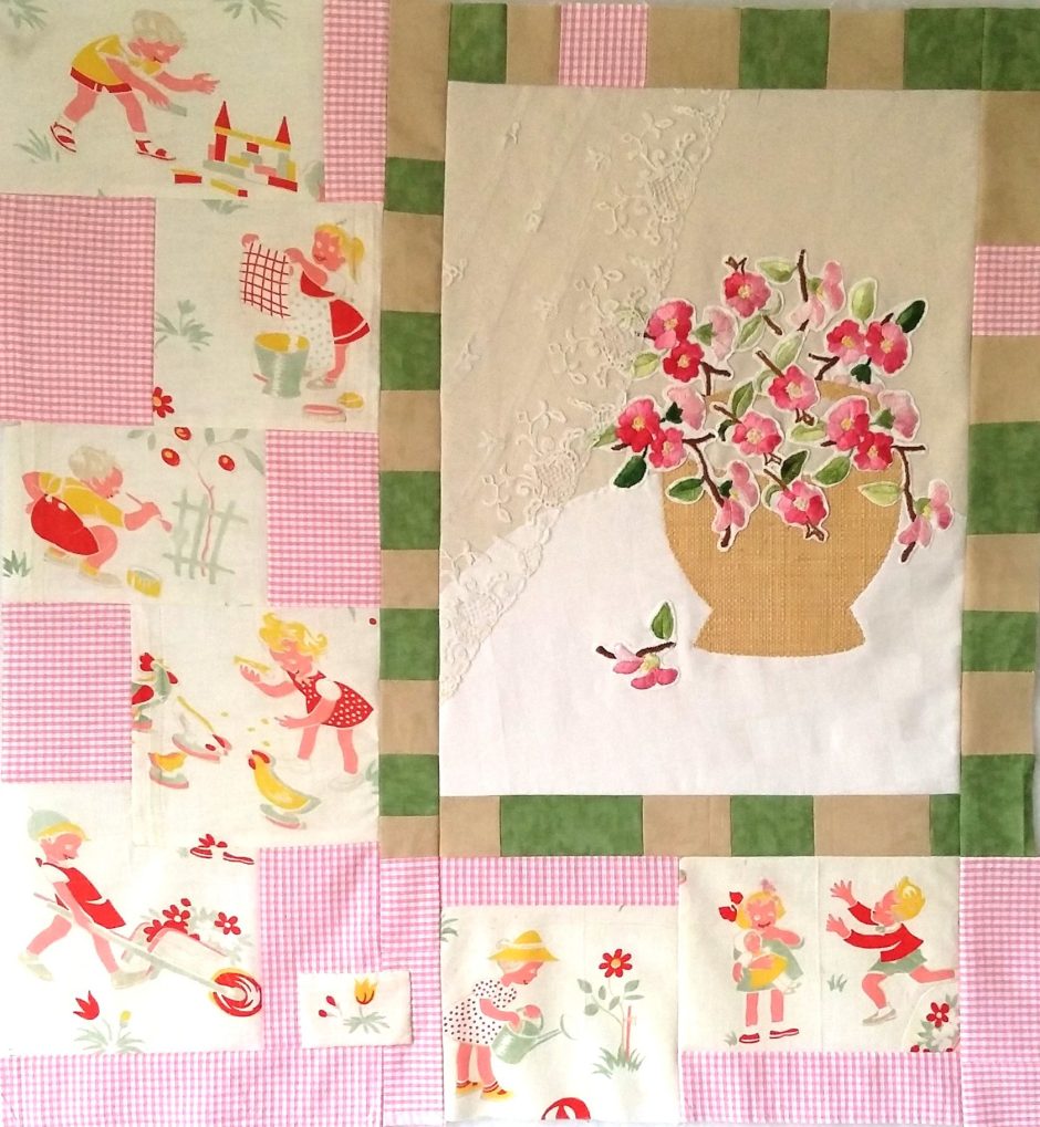 Kristine est de nouveau chez nous la première à avoir terminé le challenge du mois. Elle a coupé des draps de lit des poupées de son enfance : un tissu plein de charme vintage et un vichy rose parfaitement complémentaire… Le bouquet central du médaillon n’est que partiellement entouré, faute de tissu suffisant. Mais après tout, on peut tout se permettre dans ce challenge, c’est que qui en fait le charme !