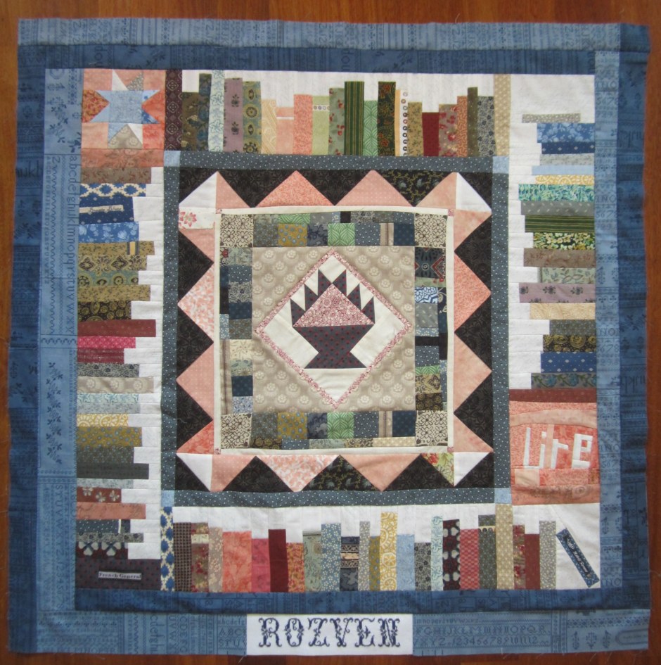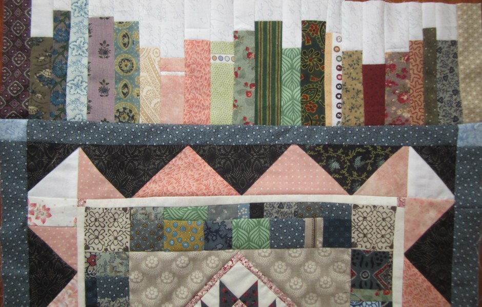 Autour du panier central aux formes traditionnelles, une bordure irrégulière l’encadre. Irrégulière ? Oui, des pointes sont mangées, les fins de bandes ne tombent pas bien, les tissus sont faits de scraps… mais comme un quilt vintage, ces imperfections n’enlèvent pas l’impression générale d’harmonie. Du moins, c’est mon point de vue. Puis viennent les livres, deux étagères de bouquins et deux piles sur les côtés. Comme vous le voyez, je n’ai pas fini… l’été est plein d’autres activités ! Rendez-vous donc bientôt pour la suite…