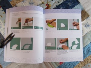 puis découpé chaque arc de cercle. Je l’ai fait en 2 exemplaires car je craignais l’usure des gabarits ! C’était superflu. J’ai fait cinq arcs comme le conseillait Bonnie Hunter ; un nombre impair dans ce cas est plus futé car on se retrouve du « bon côté » à la fin d’un éventail. Et puis, comme les fleurs dans un bouquet, c’est plus esthétique sans doute !