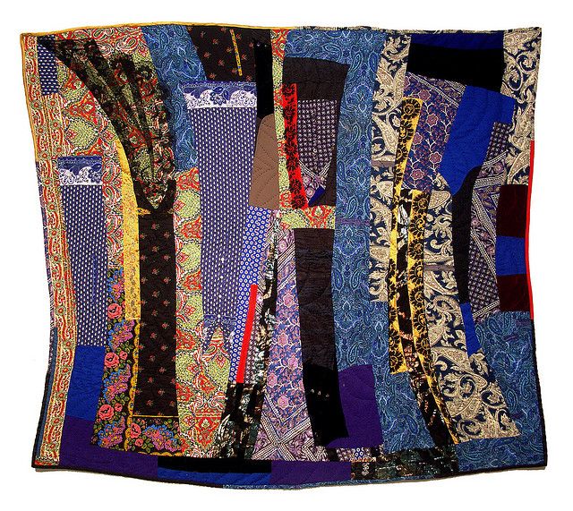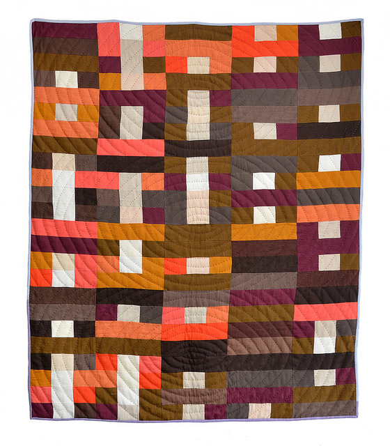 Comme pour le quilting traditionnel à la main, on peut utiliser un cercle ou bien un poids (comme de nombreuses quilteuses japonaises). En revanche, maintenant j’utilise un fil plus épais et ma préférence va vers le coton perlé n° 8 avec une aiguille à broder pointue n° 7. Le dessin peut suivre librement les coutures ou faire un tout autre motif, c’est votre choix ! Le geste est le même qu’avec de fines aiguilles between, mais les points sont plus longs. Ce quilting est apparenté aux traditions multiples qui utilisent le simple point avant, longuement évoqué ici. J’avoue avoir du mal à garder mes points aussi longs que j’aimerais, comme du sashiko. C’est pourtant plus adapté au style de ce matelassage. C’est peut-être mon 10e quilt quilté au coton perlé mais certainement pas le dernier !