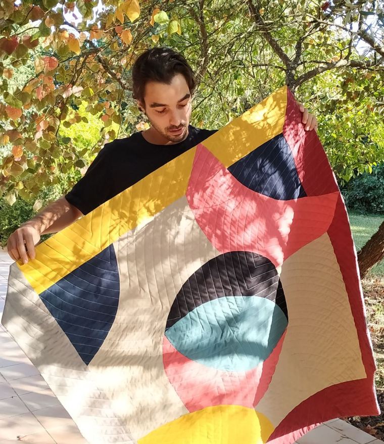 Simon fait des études artistiques, vous avez assisté à ses débuts dans le patchwork par ici. Le premier fut l’occasion de lui apprendre les bases du patchwork, c’était son épreuve à présenter à ses profs… qui ont beaucoup aimé !