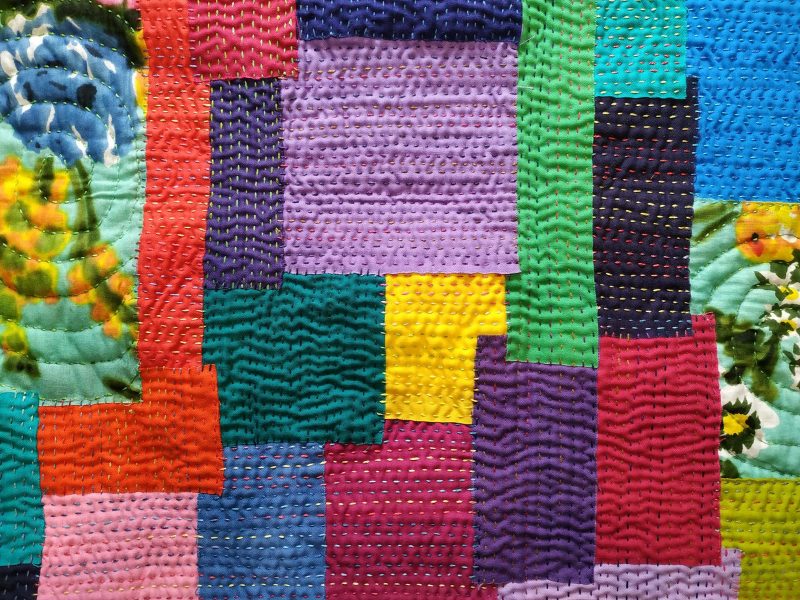 Il faut habiller le mot, aussi beau soit-il ! Kristine s’est inspirée des quilts d’Inde où les femmes font tenir des pièces de tissu avec un point avant. De la reprise utilitaire et nécessaire, elles font des œuvres d’art, en Inde mais aussi un peu partout ailleurs (au Japon, cela s’appelle le Boro). Cette année, mon amie Sujata Shah donne des cours sur cette méthode par internet. Les quilteuses américaines en raffolent !