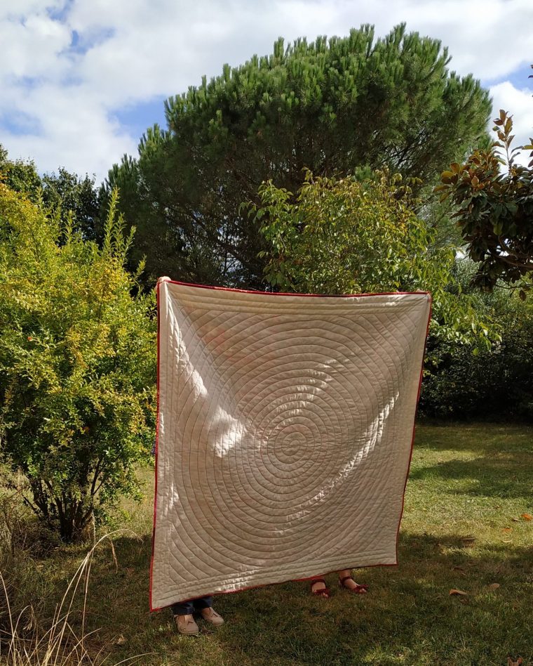 Le quilting est en spirale, technique expliquée ici, et nous trouvons toutes que c’est très réussi ! Pourquoi n’ai-je pas pris de photo de près pour vous le montrer ? Il est au fil rouge vif, c’est pourquoi on le devine quand même sur la photo.
