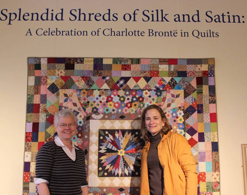 Dans le Yorkshire, c’était en 2016 la commémoration des 200 ans de la naissance de Charlotte Brontë (son roman le plus connu : Jane Eyre, monument de la littérature britannique). Or, elle et ses sœurs avaient cousu un quilt en soie, taffetas, velours et coton, qu’on imagine venir de leurs propres robes. Bien sûr, la technique est « à l’anglaise » et des papiers (lettres, journaux) restent emprisonnés dans cet ouvrage… qui n’est pas un vrai quilt puisqu’il n’est pas quilté (tout comme celui de Jane Austen, voir ici l’article que je lui ai consacré). Une exposition de mini-quilts sur le thème a été organisée en 2016, mais je n’ai pas trouvé de lien très intéressant fonctionnant encore, juste cette affiche montrant une reproduction de l’ouvrage des trois sœurs Charlotte, Anne et Emily :