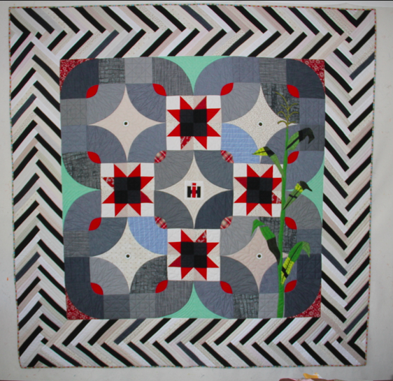 Big Red, de Victoria Findlay Wolfe (2014) avec le sigle McCormick au centre du quilt et une bordure qui rappelle les traces profondes laissées dans les champs par les tracteurs.