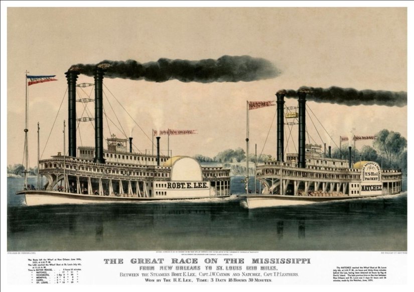 La bande dessinée nous raconte de manière assez fidèle la course engagée entre deux capitaines de steamers (bateaux propulsés à la vapeur grâce à une roue à aubes) en juillet 1870. Tous les coups étaient permis et l’envie de gagner était attisée par les paris gigantesques dans tout le pays ! Cette course particulière est restée fameuse, en raison de son enjeu : démontrer que les bateaux avaient encore un avenir en ralliant New-Orleans à Saint-Louis en moins de 4 jours, malgré la concurrence féroce du chemin de fer…