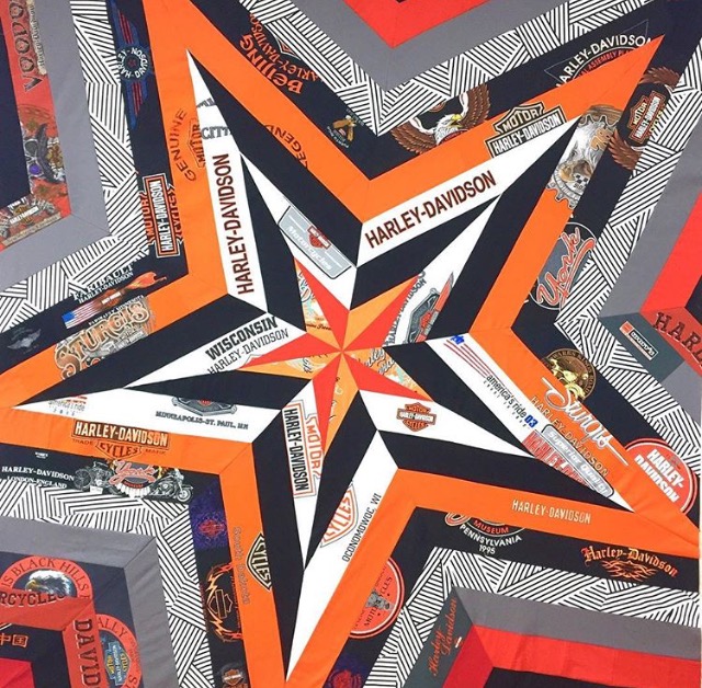 Superbe quilt fait de tissus et de tee-shirts, créé par notre autre Star de l’étape, Victoria Findlay-Wolfe. Ce modèle, Star Storm, est vendu ici. Attention, envoi postal (pas en PDF).