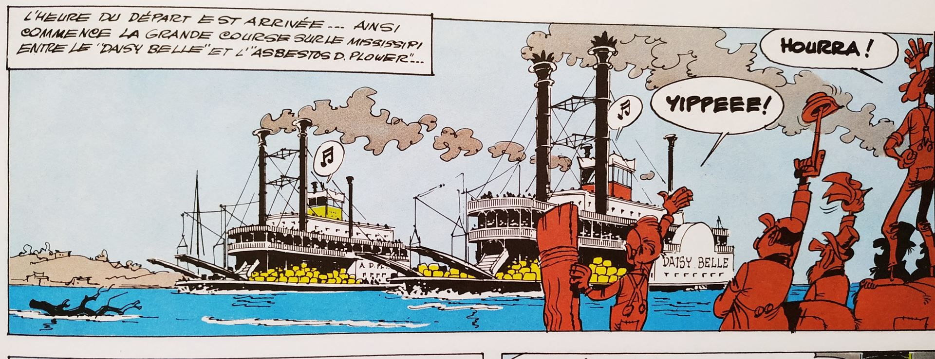Embarquons sur ce fleuve, grande voie de communication qui coule du Nord au Sud, avec des dessins de Morris et un scénario de Goscinny dans un album qui évoque la course entre deux capitaines ennemis, à partir de la Nouvelle-Orléans jusqu’à Minneapolis.