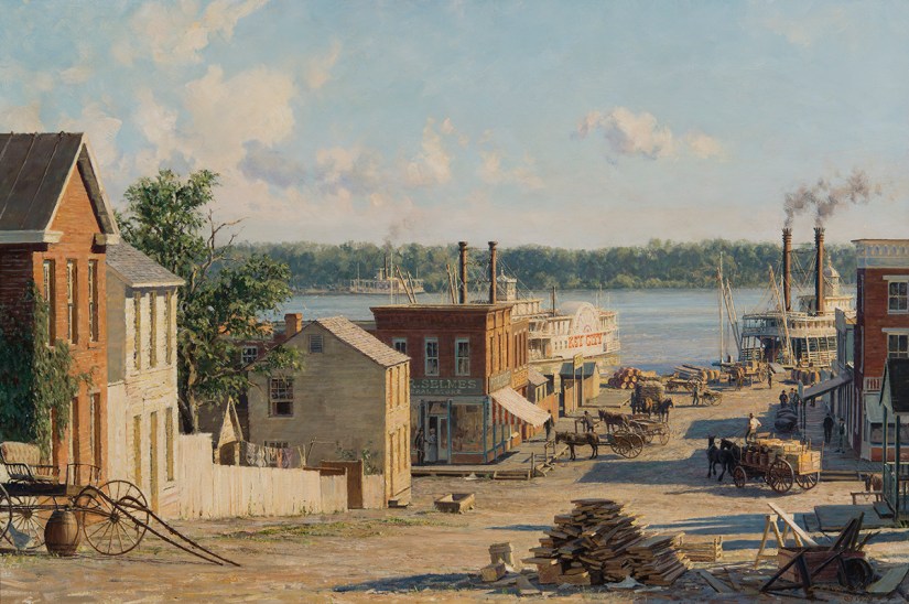 Enfant, Samuel Clemens avait cette vue du Mississippi de chez lui. Représentation artistique de John Stobart (1979).